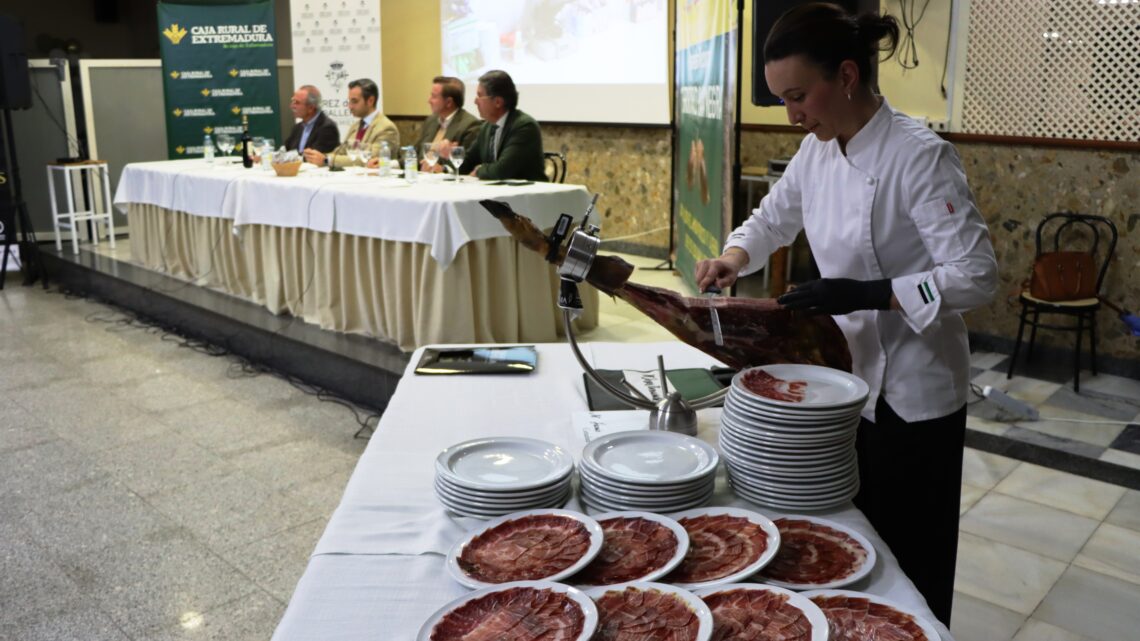 El producto estrella de la dehesa extremeña estuvo presente en las Jornadas con un formato atractivo en el que los asistentes pudieron disfrutar de su degustación con la labor de María Jesús Benavides, cortadora, a la vez que participar en el coloquio.