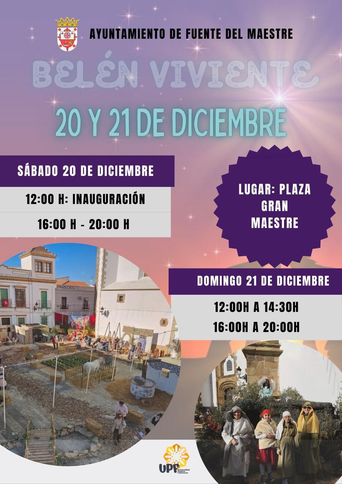 Los días 20 y 21 de Diciembre (sábado y domingo) podrá visitarse el gran Belén Viviente que, por primera vez, podrá lucirse en la también monumental Plaza del Gran Maestre (“El Corro”) de Fuente del Maestre. Un entorno patrimonial e histórico de gran valor, en el que desde este miércoles 17, los operarios del ayuntamiento fontanés están trabajando coordinados por la Concejala de la UPF Isa Chaves.