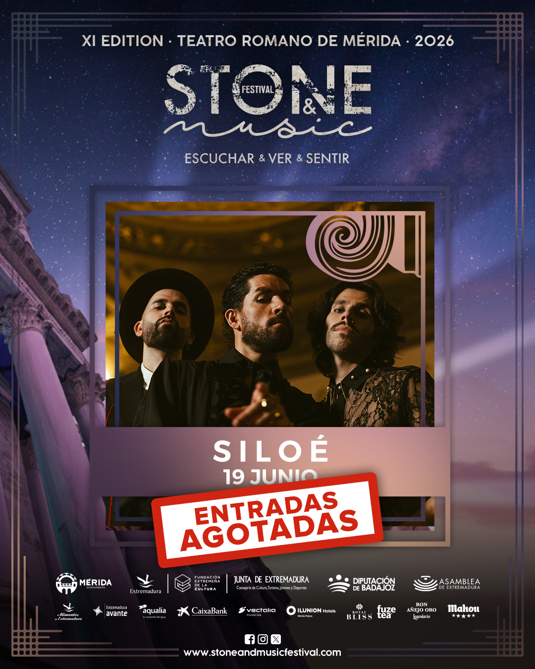 El Teatro Romano de Mérida contará con el aforo completo para recibir a Siloé. El trío vallisoletano ha colgado el cartel de ‘no hay entradas’ para su concierto el 19 de junio en el STONE&MUSIC Festival, convirtiéndose en el primer sold out de la próxima edición del certamen.