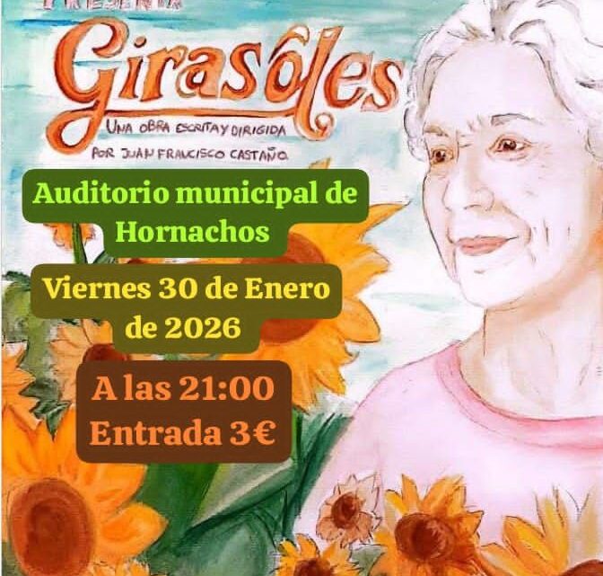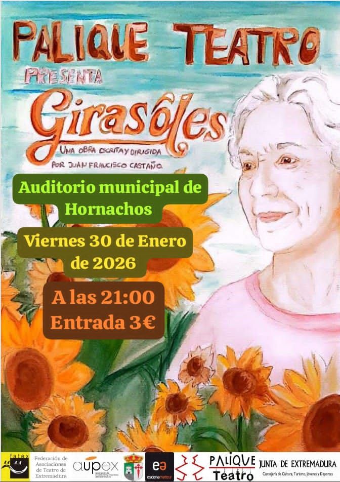 El grupo amateur Palique Teatro volverá a subir a escena su obra Girasoles el próximo 30 de enero, a las 21:00 horas, en el Auditorio Municipal de Hornachos, tras el estreno celebrado el pasado mes de diciembre. La representación supone una nueva oportunidad para el público de disfrutar de este montaje escrito y dirigido por Juan Francisco Castaño, responsable también de la dirección artística de la compañía.