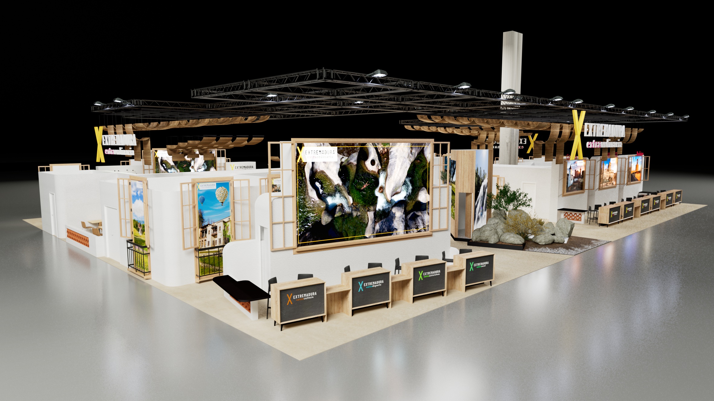El stand de la región está inspirado en el concepto de ‘Extremadura Extraordinaria’ -lema por el que se apuesta un año más- y que invita a un viaje más emocional y sensorial. “Es un espacio inmersivo y sensorial, pensado para que quienes nos visiten sientan que entran en Extremadura. La letra X se convierte en el eje del relato, como ese punto en el mapa donde señalamos que hay algo valioso, ese tesoro”, ha señalado Bazaga.