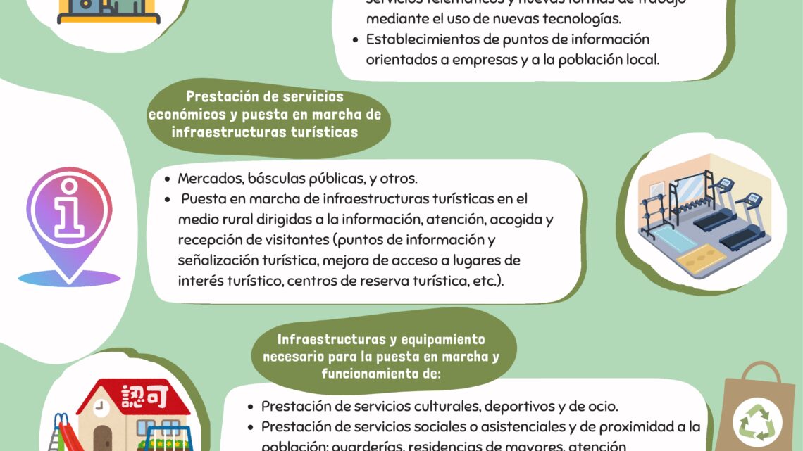 - La puesta en marcha de infraestructuras turísticas en el medio rural dirigidas a la información, atención, acogida y recepción de visitantes (puntos de información y señalización turística, mejora de acceso a lugares de interés turístico, centros de reserva turística, etc.).