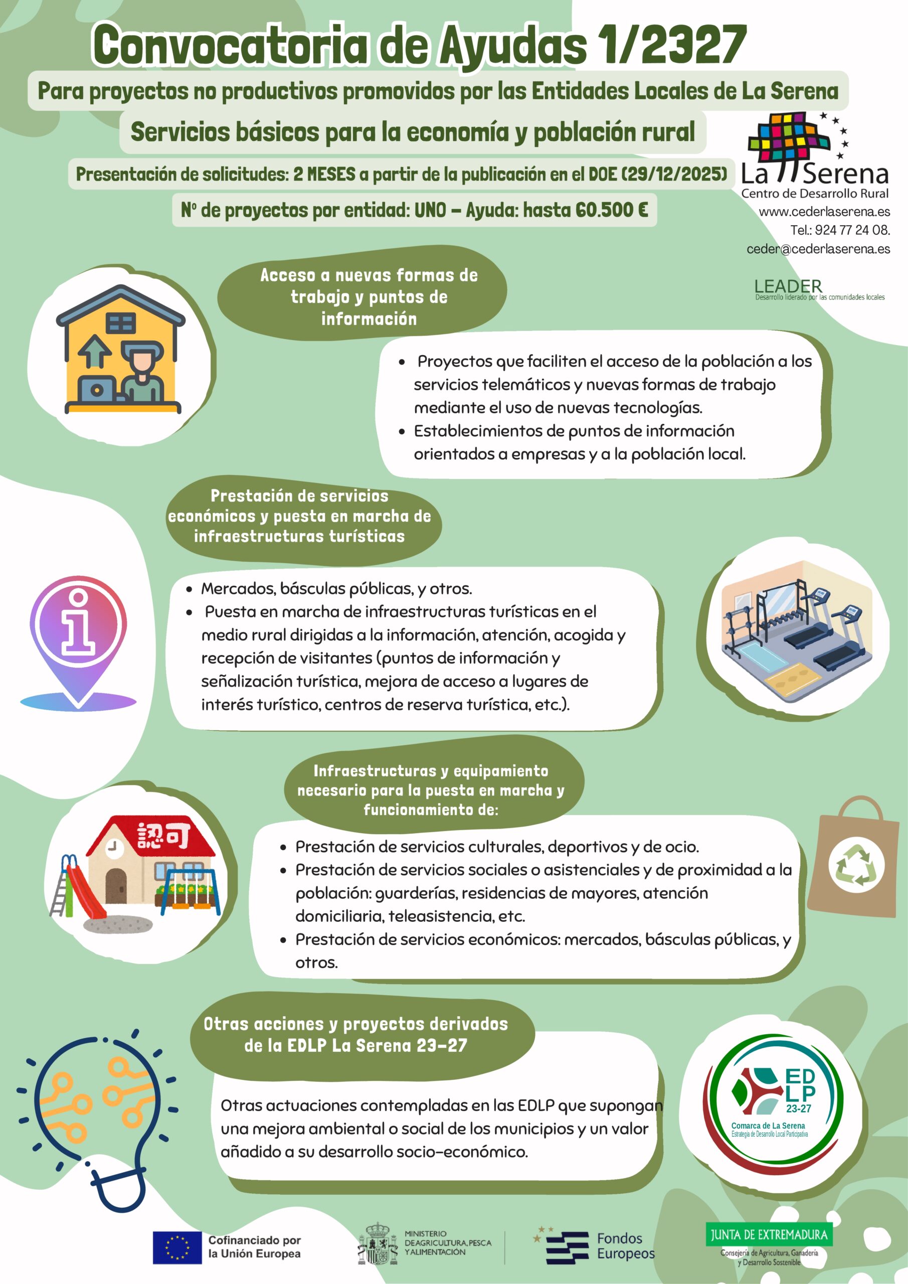 Continúa abierta la Convocatoria de Ayudas 1/2327 para PROYECTOS NO PRODUCTIVOS promovidos por las Entidades Locales del ámbito geográfico de actuación del CEDER “La Serena”, que comprende los siguientes de: Benquerencia de la Serena (La Nava, Helechal, Puerto Mejoral, Puerto Hurraco), Cabeza del Buey (Almorchón), Campanario (La Guarda), Capilla, Castuera, La Coronada, Esparragosa de la Serena, La Haba, Higuera de la Serena, Magacela, Malpartida de la Serena, Monterrubio de la Serena, Orellana de la Sierra, Orellana la Vieja, Peñalsordo, Quintana de la Serena, Valle de la Serena, Zalamea de la Serena (San Cristóbal de Zalamea) y Zarza–Capilla. La dotación financiera es de 1.000.000,00 € para “Servicios básicos para la economía y la población rural”.