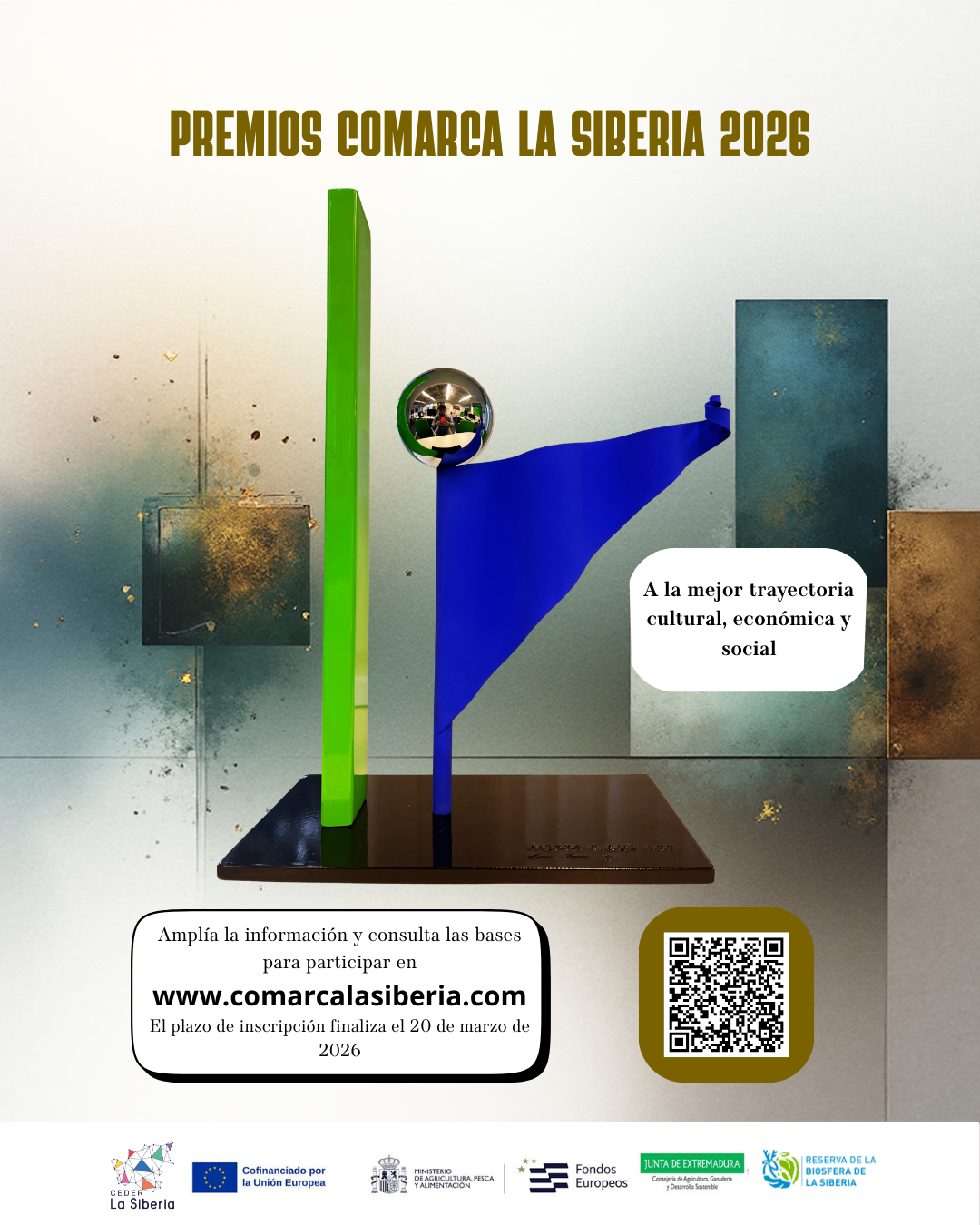 El p𝗹𝗮𝘇𝗼 𝗱𝗲 𝗮𝗱𝗺𝗶𝘀𝗶𝗼́𝗻 será hasta el 𝟐𝟎 𝗱𝗲 𝗺𝗮𝗿𝘇𝗼 𝗱𝗲 𝟮𝟬𝟮𝟔. Los 𝗽𝗿𝗲𝗺𝗶𝗼𝘀 se entregarán durante el 𝗗𝗶́𝗮 𝗱𝗲 𝗹𝗮 𝗖𝗼𝗺𝗮𝗿𝗰𝗮 𝗱𝗲 𝗟𝗮 𝗦𝗶𝗯𝗲𝗿𝗶𝗮 𝟮𝟬𝟮𝟔, en el marco de la “𝗙𝗶𝗲𝘀𝘁𝗮 𝗱𝗲 𝗹𝗮 𝗝𝗮𝗿𝗮 𝗲𝗻 𝗙𝗹𝗼𝗿”, que se celebrará el 𝘀𝗮́𝗯𝗮𝗱𝗼 𝟏𝟖 𝗱𝗲 𝗮𝗯𝗿𝗶𝗹 𝗲𝗻 Sancti Spíritus. Para consultar las 𝗯𝗮𝘀𝗲𝘀 lo podéis hacer a través del 𝗰𝗼́𝗱𝗶𝗴𝗼 𝗤𝗥 o en el siguiente 𝗲𝗻𝗹𝗮𝗰𝗲: Enlace Bases 𝐏𝐫𝐞𝐦𝐢𝐨𝐬 𝟮𝟬𝟮𝟔 𝐂𝐨𝐦𝐚𝐫𝐜𝐚 𝐝𝐞 𝐋𝐚 𝐒𝐢𝐛𝐞𝐫𝐢𝐚