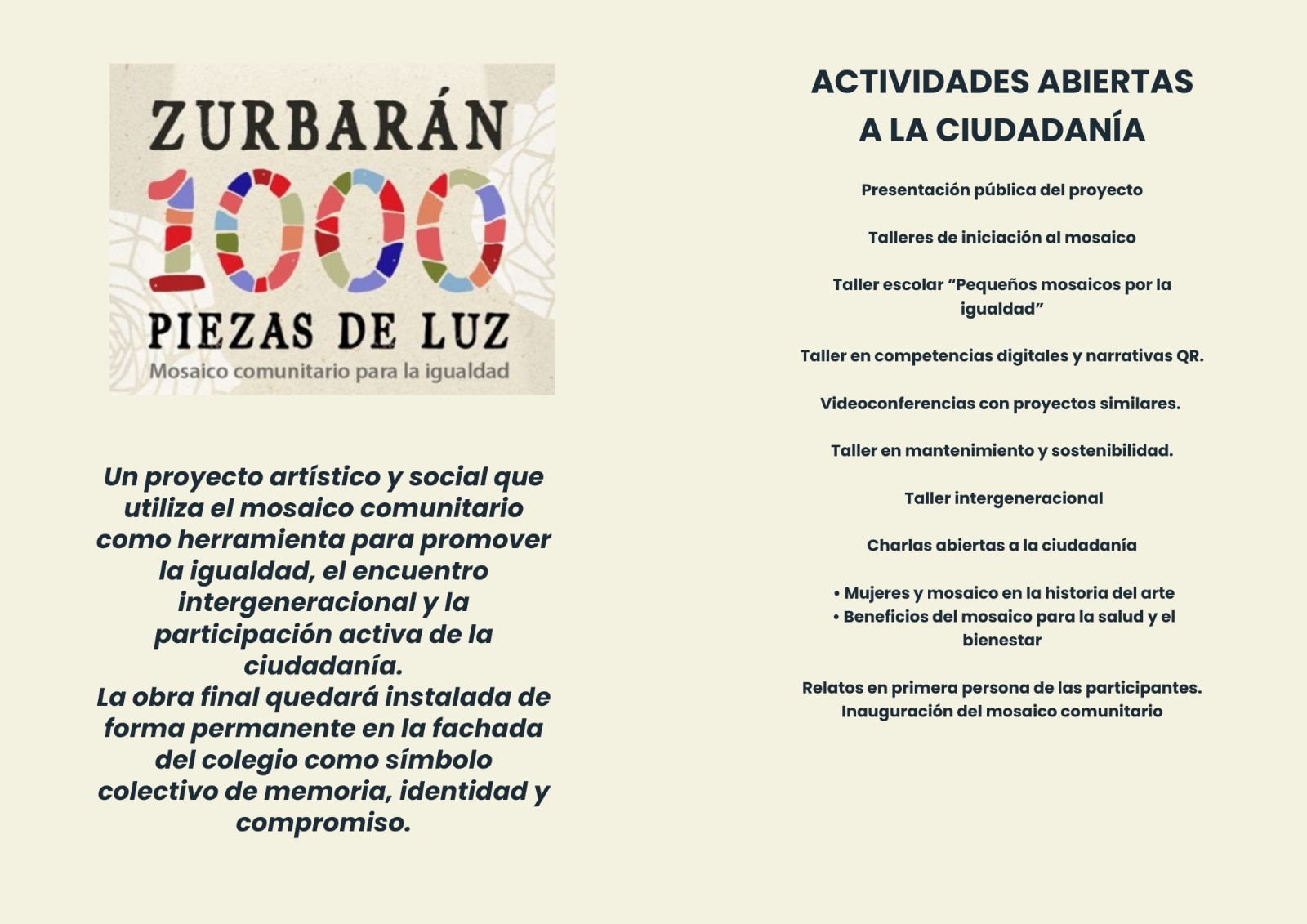 Según ha avanzado, se espera comenzar a construir el mosaico en un mes, aproximadamente. Este se compondrá de mil teselas, cada una de las cuales representará una historia, un recuerdo o un mensaje vinculado al papel de las mujeres en la vida de Zurbarán y al compromiso colectivo con una sociedad más igualitaria. Dichas teselas serán elaboradas en diversos talleres intergeneracionales y abiertos a la participación de todos los vecinos, y serán dirigidos por la “experta en mosaicos” María Abril.
