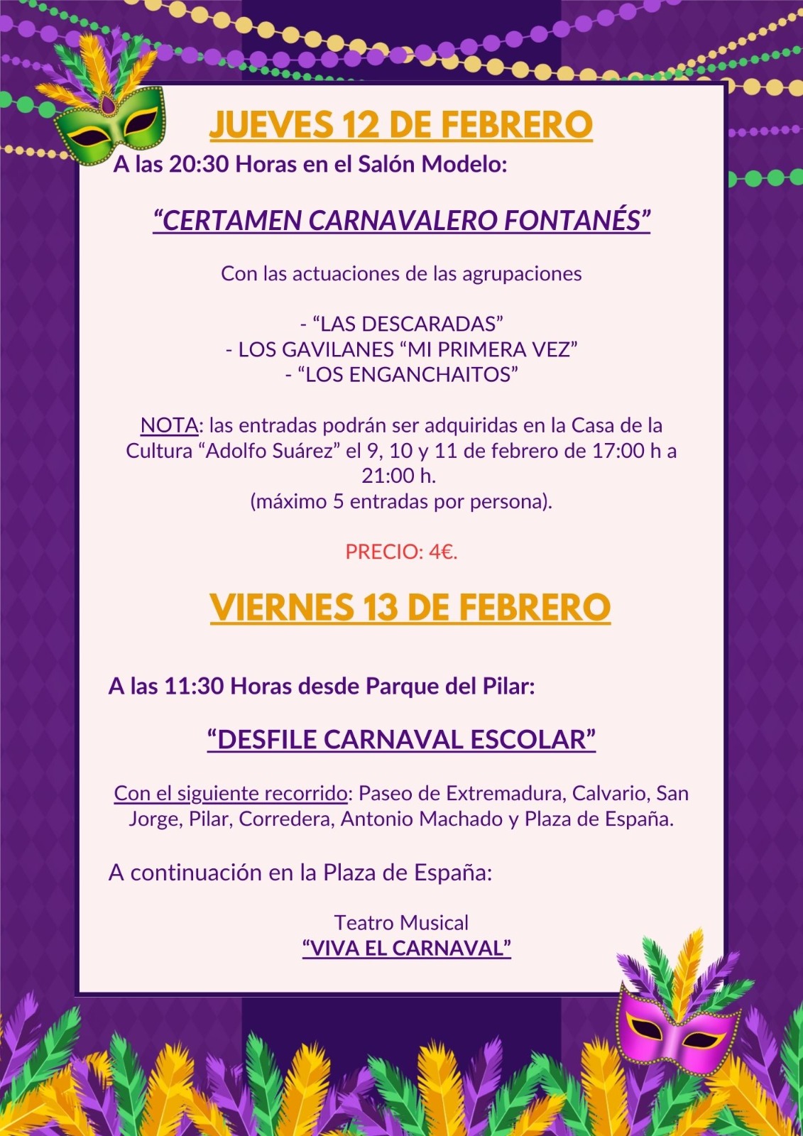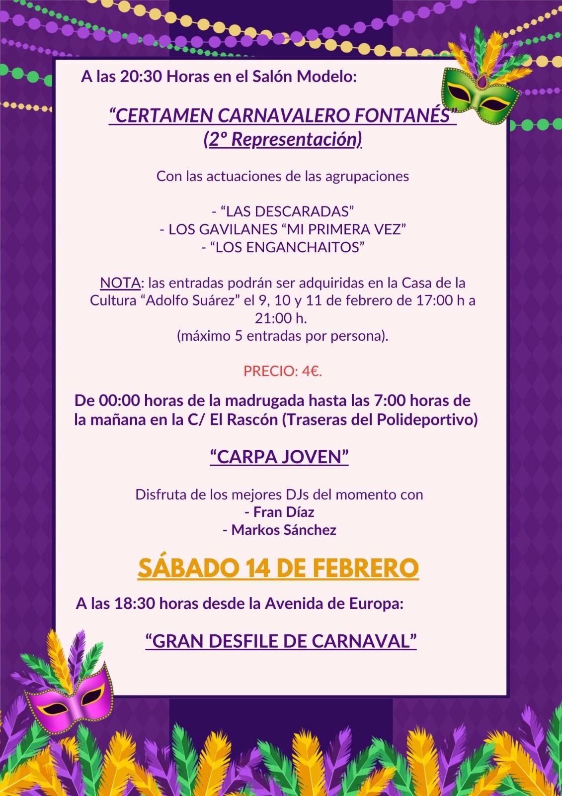 Las entradas para este Certamen Carnavalero Fontanés se podrán adquirir los días 9, 10 y 11 de febrero, de 17:00 a 21:00 horas, en la Casa de la Cultura “Adolfo Suárez”. El precio de cada entrada será de 4 €, y se venderán como máximo 5 entradas por persona.