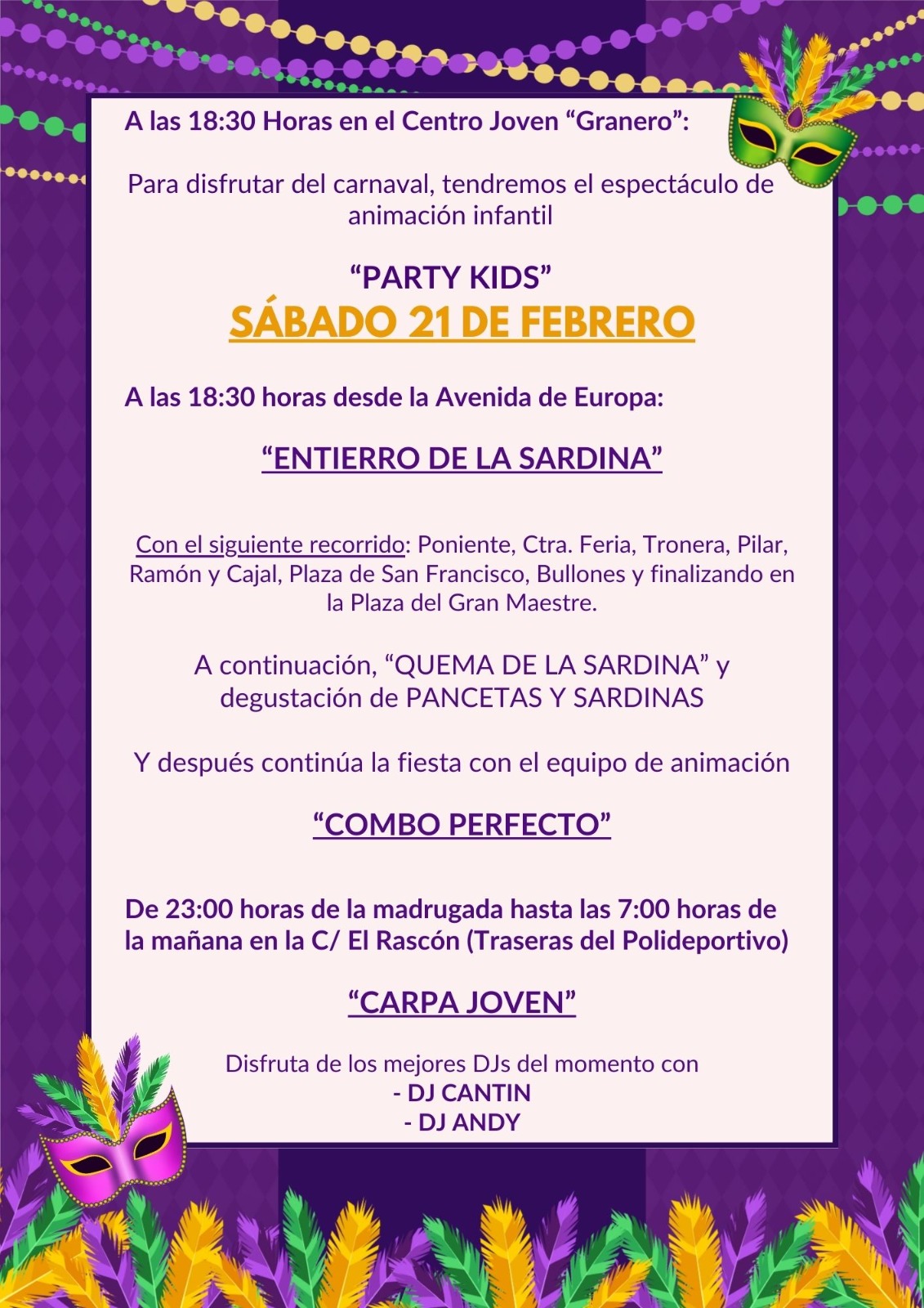 A continuación, ya en la Plaza del Gran Maestre, será la tradicional “Quema de la Sardina”, y habrá degustación de pancetas y sardinas. Y después, continuará la fiesta con el equipo de animación “Combo Perfecto”.