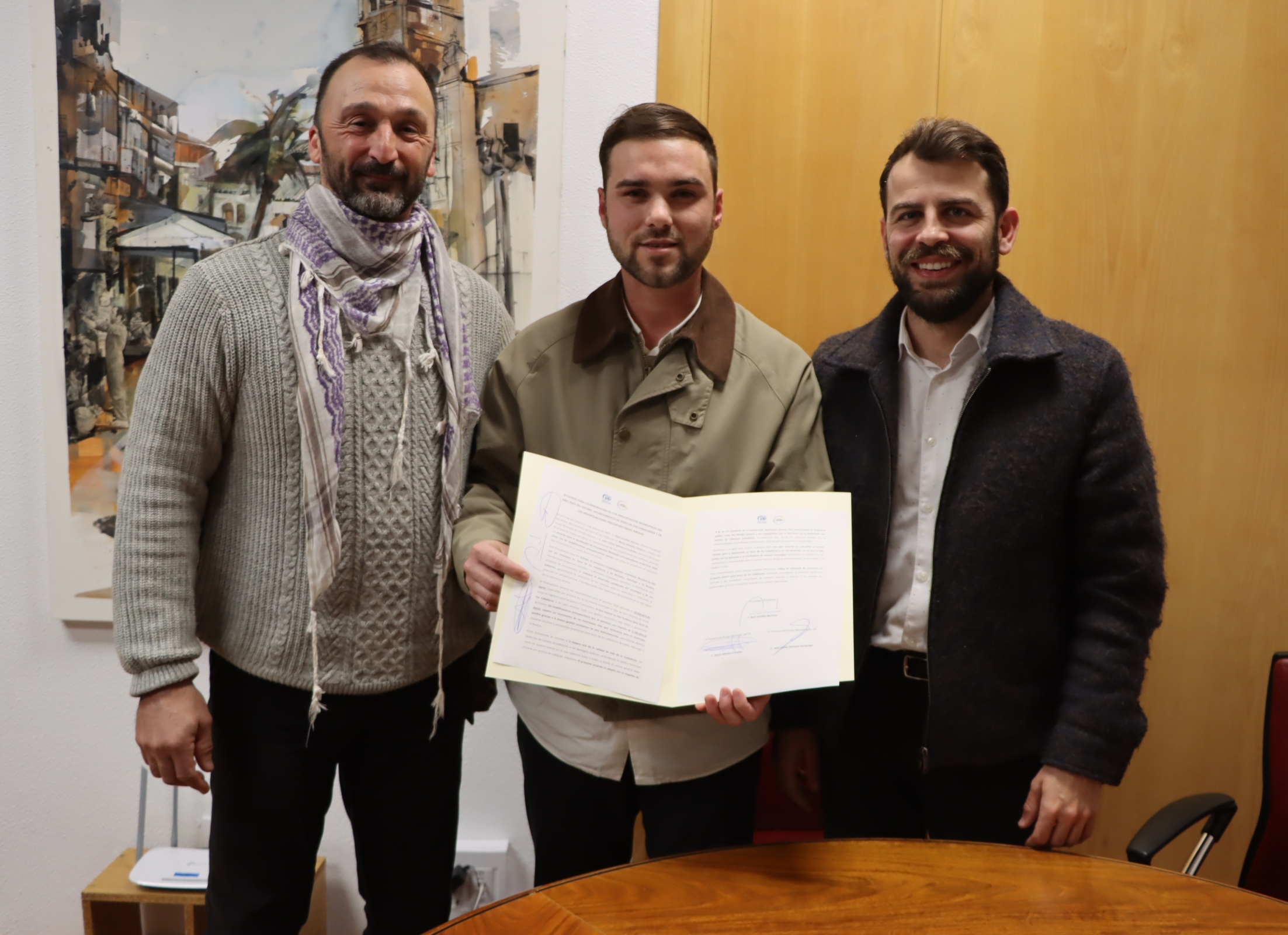 El alcalde de Jerez de los Caballeros, Raúl Gordillo, junto con el primer teniente de alcalde y portavoz del grupo municipal del PP, Mario Méndez y el portavoz del grupo municipal de Unidas por Jerez, Juan Carlos Santana, rubricaron en la tarde de ayer el acuerdo alcanzado para los Presupuestos generales 2026, el más alto de toda la historia de esta ciudad con una cuantía de 10.010.677,30 euros.
