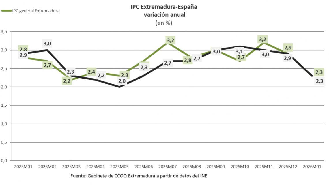 El dato del IPC de los precios en el primer mes del año, sitúa el dato de inflación anual en Extremadura en el 2,3 por ciento respecto al mismo mes del año anterior, igualándose con el dato nacional. Este dato supone una disminución de seis décimas respecto al mes anterior.