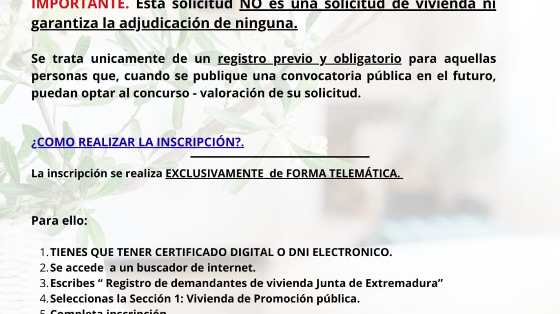 La Junta de Extremadura ha reforzado su llamamiento a la ciudadanía: la inscripción en el Registro de Demandantes de Vivienda Pública es un requisito previo, obligatorio e indispensable para poder optar, en el futuro, a una vivienda de promoción pública en la región. Así lo recuerda el Programa de Familias de Tierra de Barros–Río Matachel, que alerta de que, sin este trámite, cualquier persona interesada queda automáticamente excluida de las convocatorias oficiales.