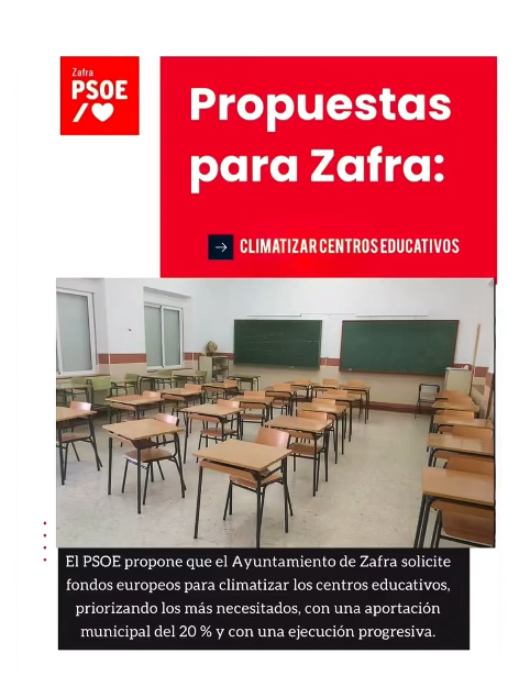La climatización integral de todos los centros educativos de Zafra podría suponer una inversión aproximada de 1.200.000 euros procedentes de fondos europeos, con una aportación municipal estimada en 240.000 euros, equivalente al 20 % del total. La portavoz socialista ha señalado que esta cantidad representa solo una parte de la inversión prevista por el equipo de gobierno para la creación de un museo del turismo.