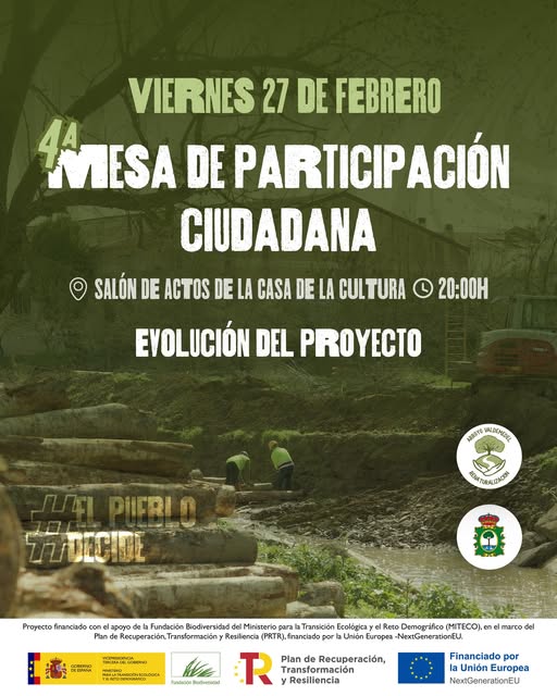 Organizada por el Ayuntamiento ribereño con el respaldo técnico de la Fundación Biodiversidad y enmarcada en el Plan de Recuperación, Transformación y Resiliencia (PRTR), financiado con fondos europeos NextGenerationEU, la sesión pretende cerrar el ciclo participativo iniciado en 2024 y abrir el debate sobre el mantenimiento y proyección futura del entorno restaurado.