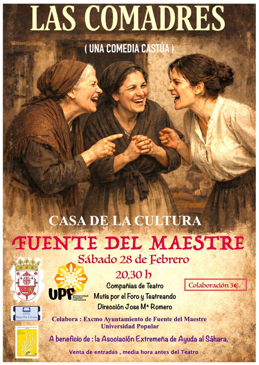 La Casa de la Cultura “Adolfo Suárez” de Fuente del Maestre acogerá, este sábado 28 de febrero, a partir de las 20:30 horas, la representación teatral de la comedia castúa “Las Comadres”, a cargo de los grupos “Mutis por el Foro” y “Teatreando”, y a beneficio de la Asociación Extremeña de Ayuda al Sáhara.