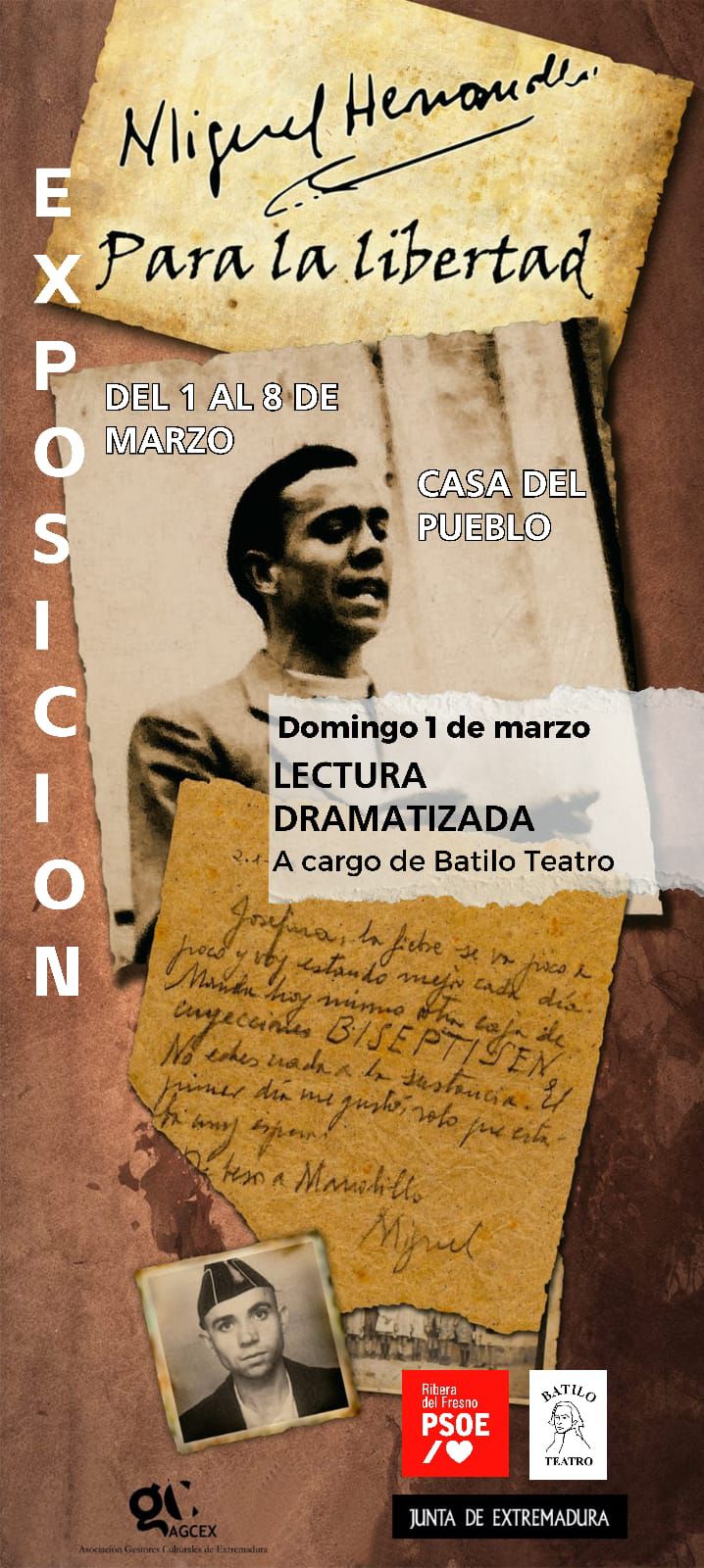 La Casa del Pueblo de Ribera del Fresno abrirá sus puertas del 1 al 8 de marzo a la exposición “Miguel Hernández para la libertad”, una propuesta cultural que recorre la vida y la obra del poeta de Orihuela y que sitúa su legado literario en el centro de la memoria democrática y el compromiso social.