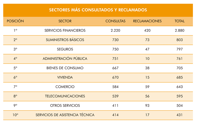 En QUINTA los BIENES DE CONSUMO con 705. Dentro de este grupo, lo más reclamado y consultado han sido los problemas con los vehículos a motor, el cártel de coches también ha generado un buen número de consultas, al estar cercana la fecha de prescripción de este tipo de reclamaciones. Problemas como averías y desconocimiento sobre la cobertura o no de la garantía, adquisición de vehículos con vicios ocultos, problemas con componentes de determinados vehículos, obstáculos a la hora de reclamar al concesionario, al taller o al fabricante, etc…