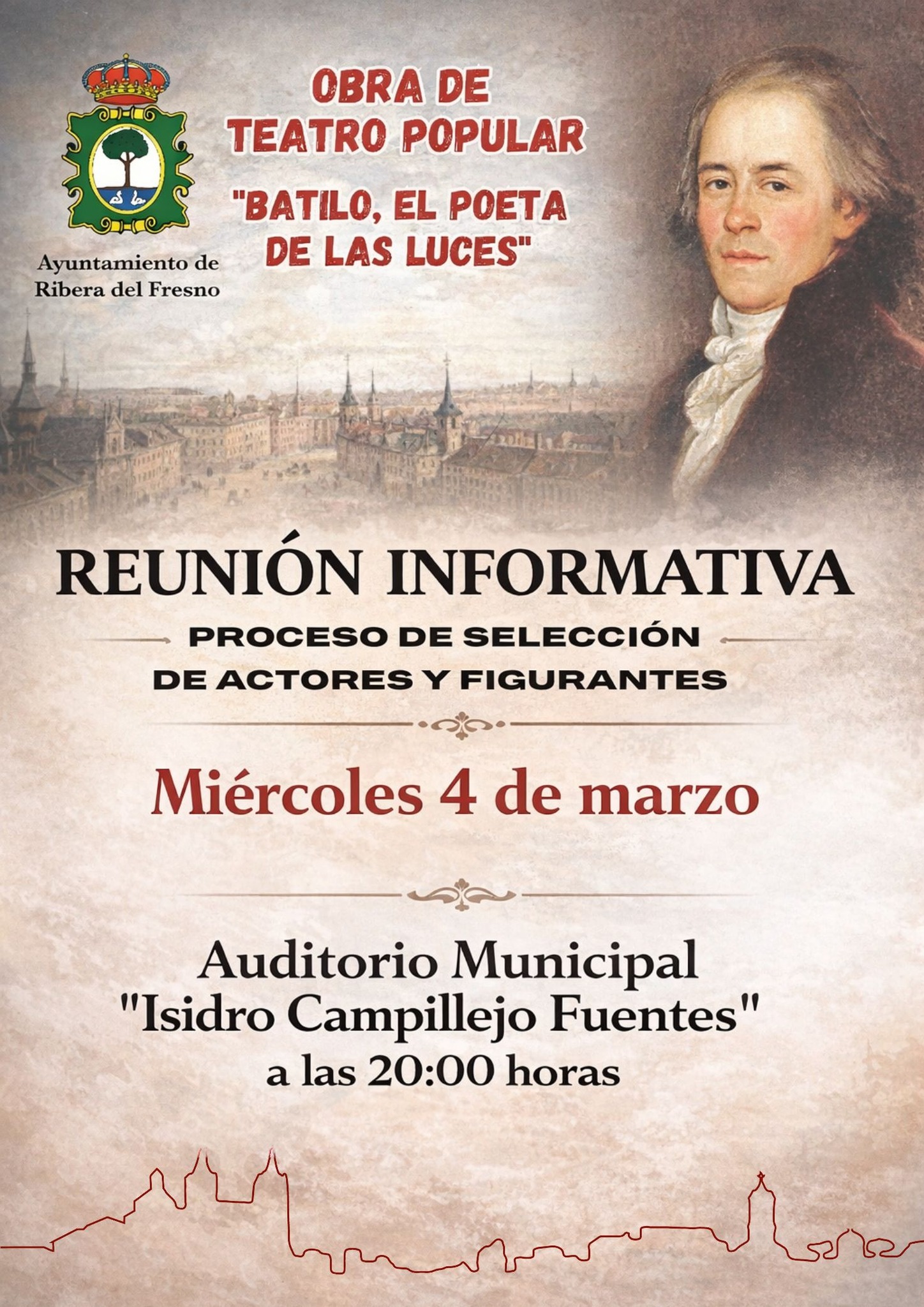Ribera del Fresno se prepara para reactivar uno de sus proyectos culturales más ambiciosos y participativos. Este miércoles 4 de marzo, a las 20:00 horas, el Auditorio Municipal “Isidro Campillejo Fuentes” acogerá la reunión informativa de la tercera edición de “Batilo, el Poeta de las Luces”, la producción teatral vecinal dirigida por Francisco Blanco que ha convertido la memoria de Juan Meléndez Valdés en eje vertebrador de identidad colectiva.