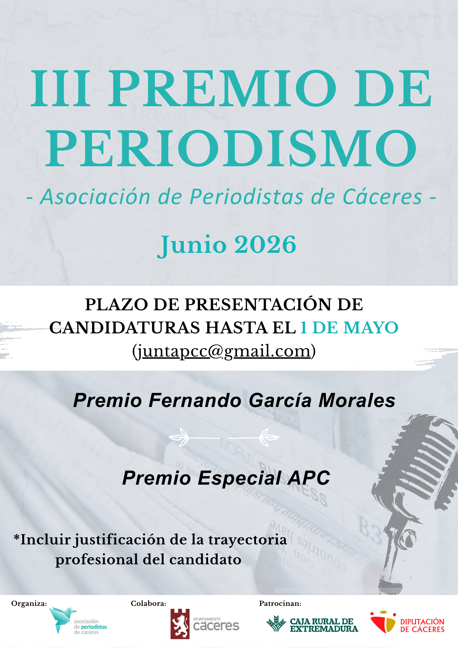 El galardón, que cuenta con el patrocinio de Caja Rural de Extremadura y de la Diputación de Cáceres, así como con la colaboración del Ayuntamiento de Cáceres, mantiene su vocación de rendir homenaje a profesionales cuya aportación al periodismo haya sido significativa y sostenida en el tiempo.