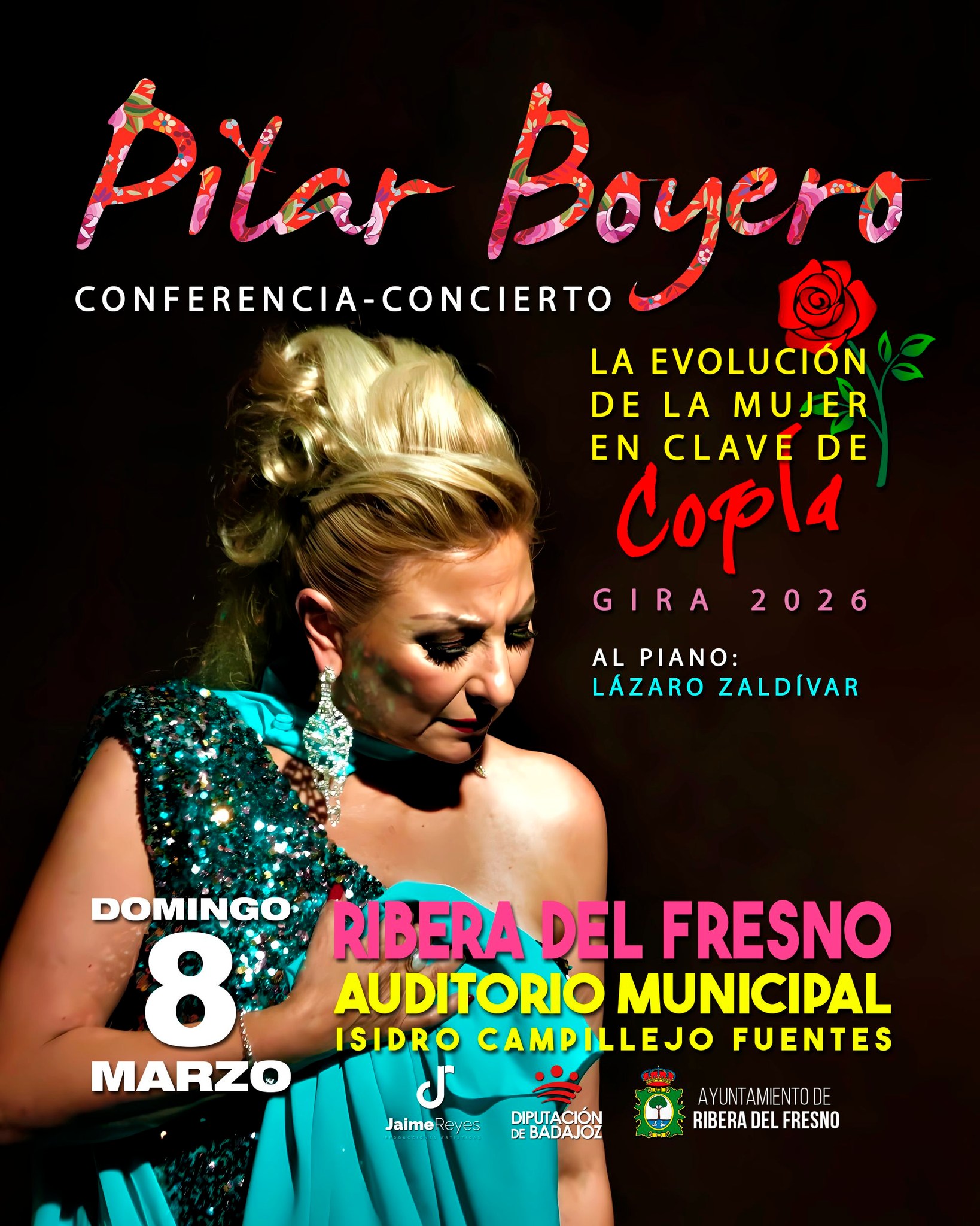 La artista estará acompañada al piano por el músico Lázaro Zaldívar, dentro de la gira cultural de 2026 que impulsa su espectáculo por distintos escenarios. La producción corre a cargo de Jaime Reyes Producciones Artísticas, con la colaboración de la Diputación de Badajoz y el Ayuntamiento de Ribera del Fresno.