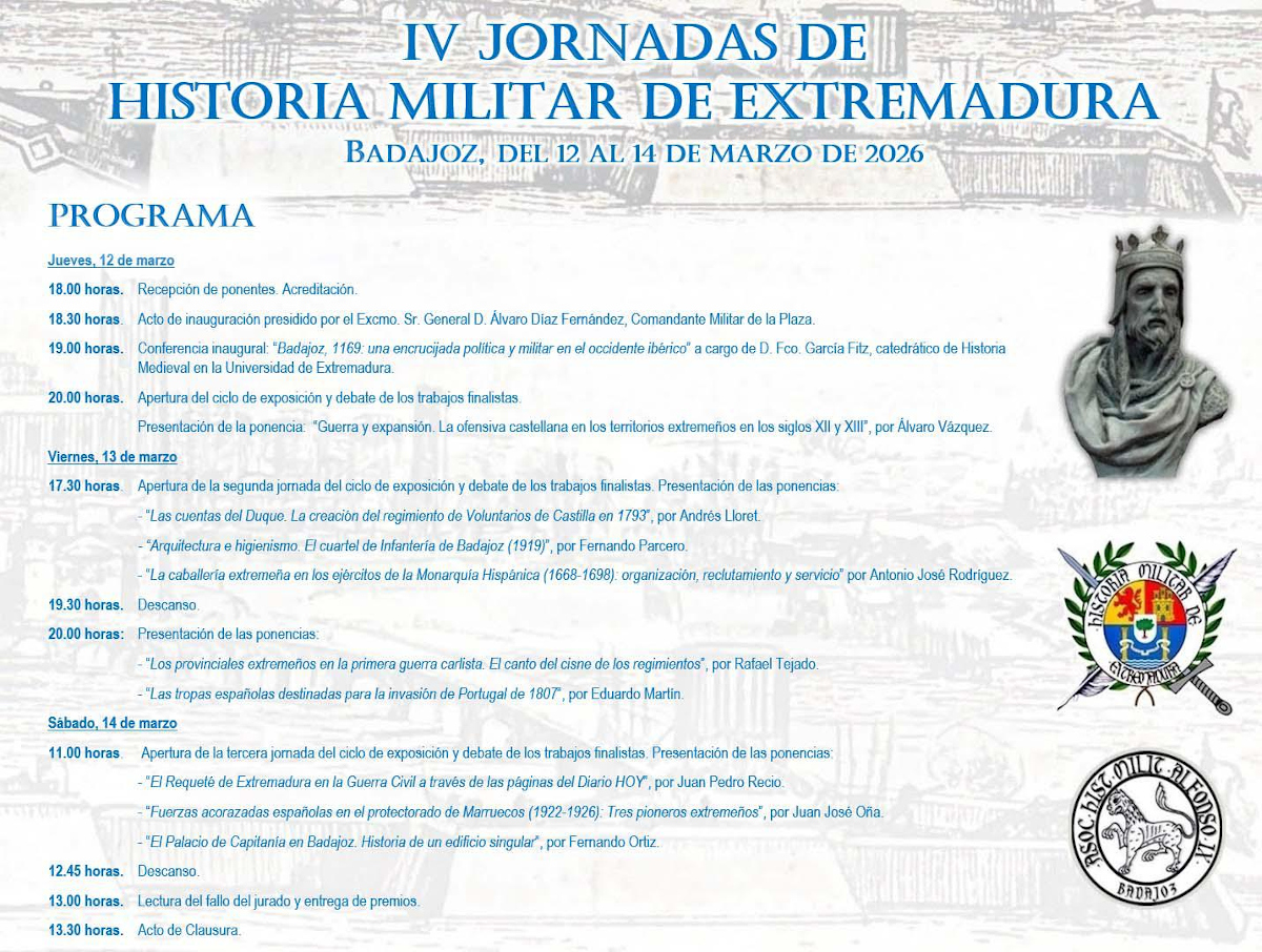 Organizada por la Asociación Histórico-Militar Alfonso IX y con la colaboración de la Brigada Extremadura XI y la Diputación de Badajoz, esta cita bianual contará con dieciséis ponencias, ocho de las cuales optarán al premio Alfonso IX de Historia Militar, dotado con un busto del citado monarca realizada por el escultor Estanislao García Olivares y 1.000 € en metálico.