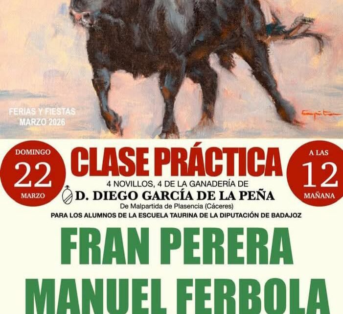 El próximo domingo, día 22, a las 12 horas, en la plaza de toros ubicada en el polígono industrial Las Eras, se celebrará esta novillada, una clase práctica en la que participarán Fran Perera, Manuel Ferbola, Fernando Donoso y Joao Mexía. Lidiarán cuatro novillos de la ganadería de Diego García de la Peña. La entrada será libre hasta completar aforo.