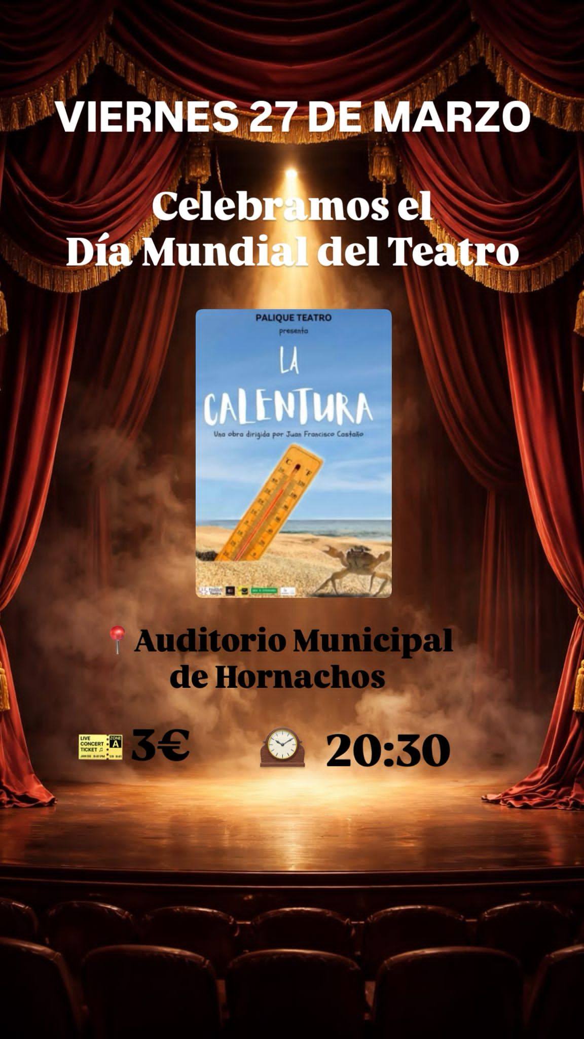 La localidad de Hornachos conmemorará el próximo viernes 27 de marzo el Día Mundial del Teatro con la representación de la comedia La Calentura, a cargo del grupo Palique Teatro, en una función prevista a las 20:30 horas en el Auditorio Municipal.
