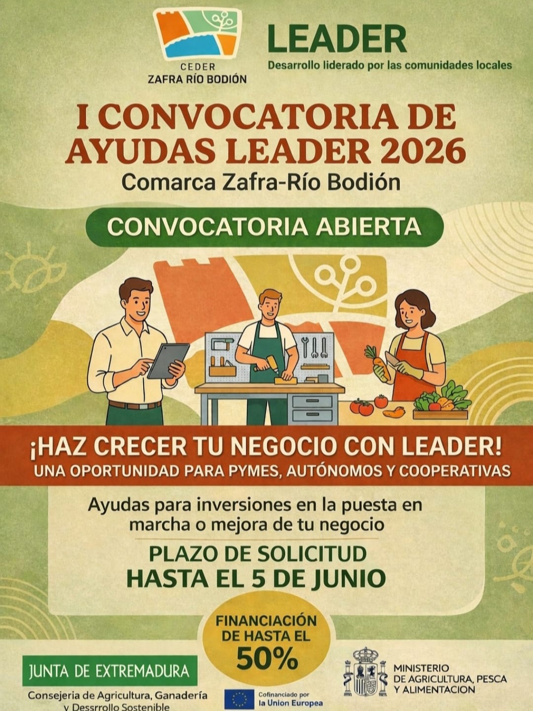 Asimismo, intervendrá el gerente del Ceder Zafra Río – Bodión, Chema Pérez; que informará sobre la I Convocatoria de Ayudas Leader 2026 , de la que pueden beneficiarse pymes, autónomos y cooperativas. La convocatoria de estas ayudas, para inversiones en la puesta en marcha o mejora de un negocio, están abiertas hasta el 5 de junio.