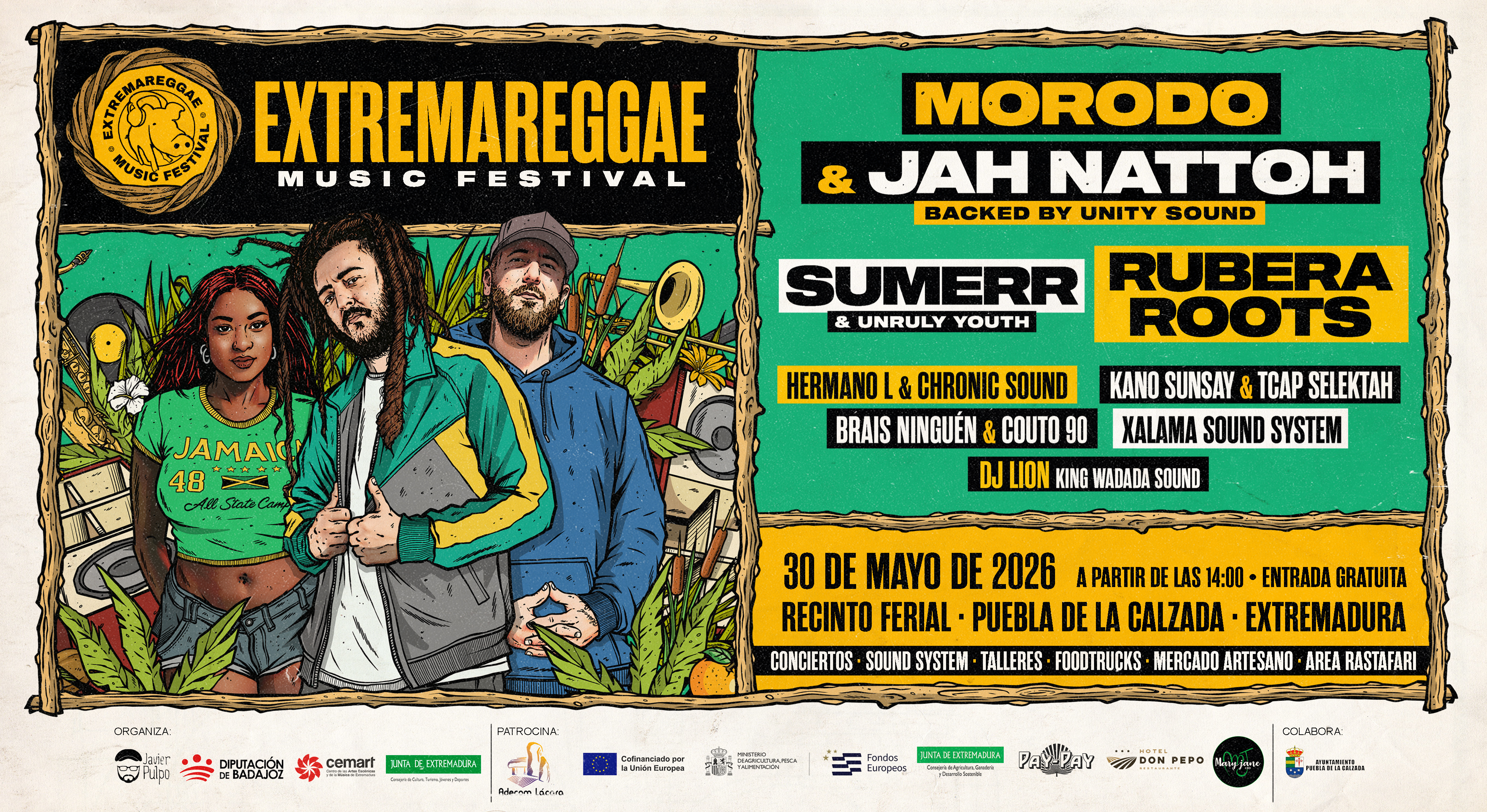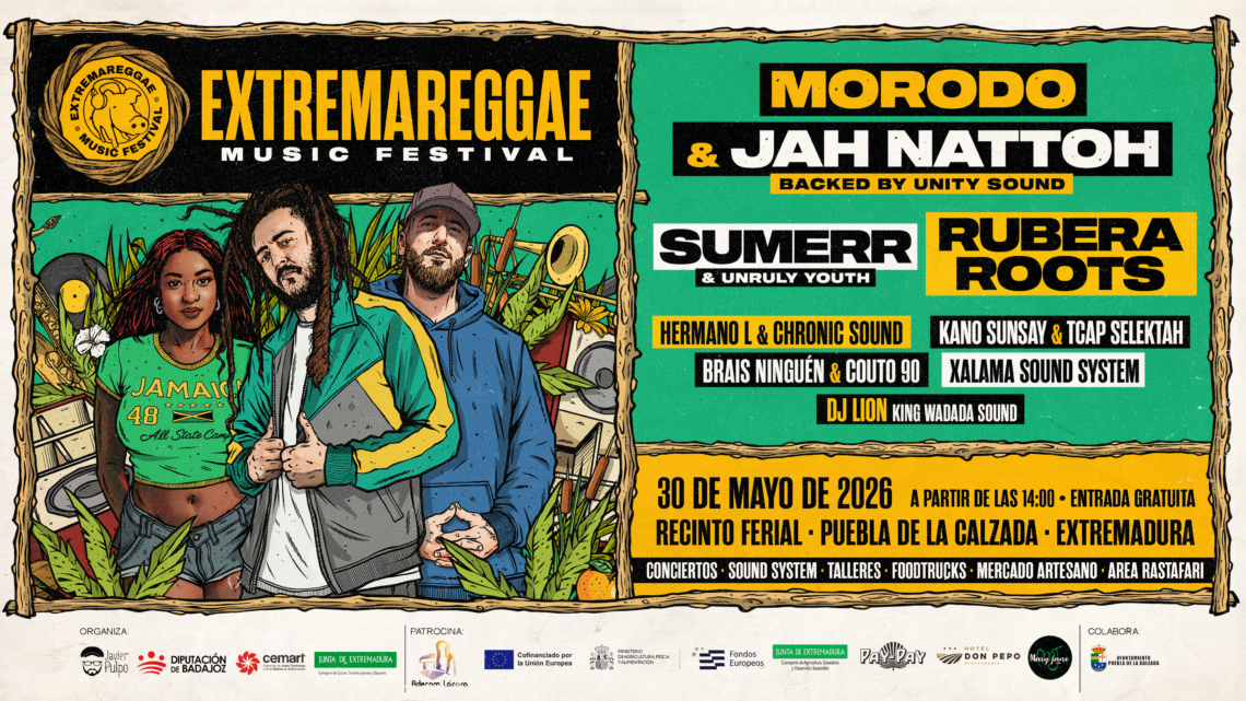 El cartel de Extremareggae 2026 estará encabezado por Morodo & Jah Nattoh, dos de los grandes referentes del reggae en español que presentarán un show conjunto acompañado por Unity Sound. Morodo, figura clave del género, ha marcado a generaciones con temas como La Esencia o Babilonia, mientras que Jah Nattoh se ha consolidado como uno de los máximos exponentes del reggae new roots y consciente, es decir, enfocado en mensajes de conciencia social, espiritualidad (rastafari), amor propio y crítica a la injusticia, y que fusiona otros ritmos como el rap, el r&b, el flamenco o el pop.