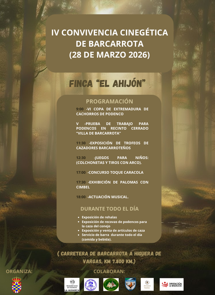 La IV Convivencia Cinegética de Barcarrota tendrá lugar este sábado día 28 a partir de las 9 de la mañana en la Finca ´El Ahijón´, situada en en el km. 7.8 de la Carretera a Higuera de Vargas. Entre sus muchas actividades, destacan la VI Copa de Extremadura de Cachorros de Podenco y la V Prueba trabajo para podencos en recinto cerrado ´Villa de Barcarrota´.