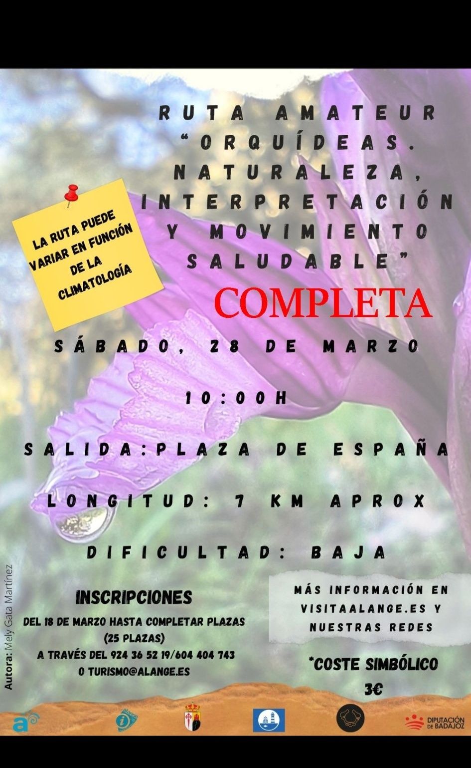 La capacidad de convocatoria de M. Teresa Monzú ha vuelto a quedar de manifiesto, superando incluso las previsiones de la propia organización. Bajo el lema “Orquídeas, Naturaleza, Interpretación y Movimiento Saludable”, la ruta programada para este próximo sábado 28 de marzo en Alange ha colgado el cartel de COMPLETA en un tiempo récord.