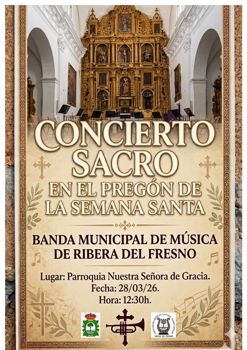 La música volverá a ocupar un lugar central en los actos previos de la Semana Santa de Ribera del Fresno. La Asociación Músico-Cultural “Santa Cecilia” y la Banda Municipal han anunciado su calendario de actuaciones para estas fechas, que arrancará con un concierto sacro el próximo sábado 28 de marzo, a las 12:30 horas, en la Parroquia de Nuestra Señora de Gracia, en el marco del pregón oficial.