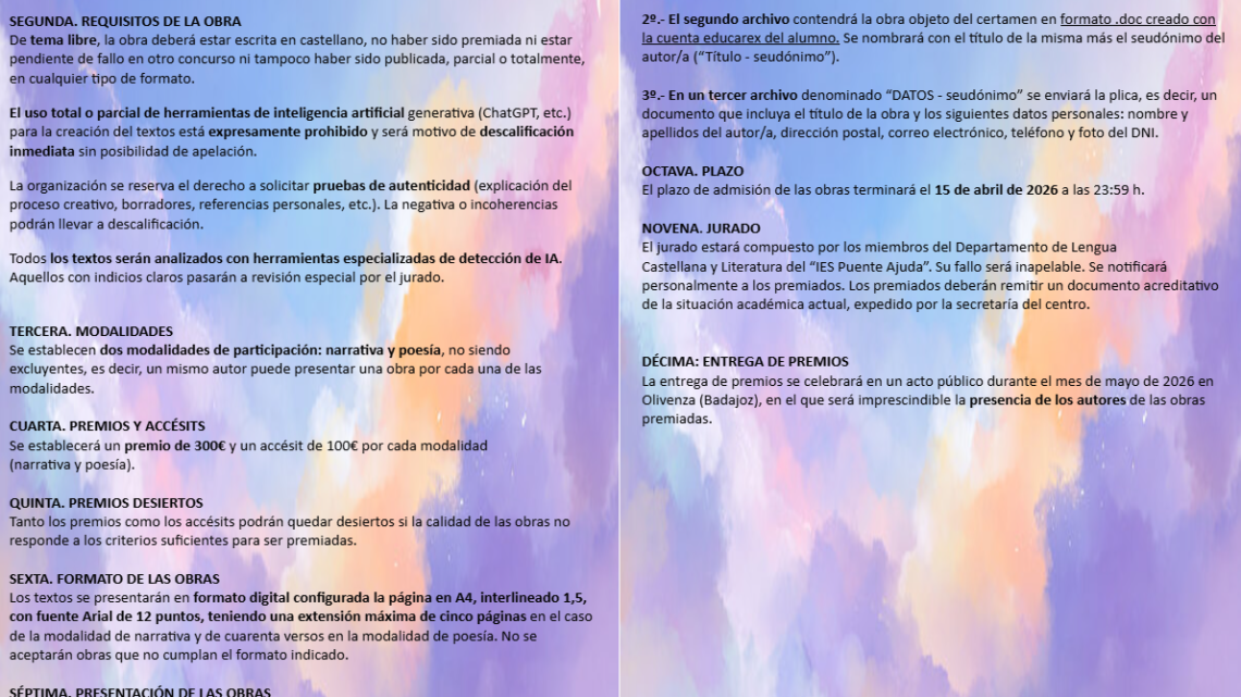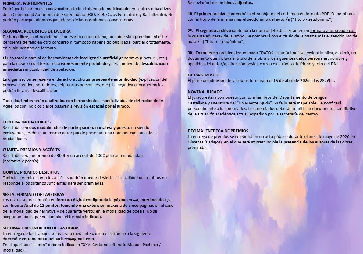 El IES Puente Ajuda ha hecho pública la convocatoria de la XXVI edición del Certamen Literario “Manuel Pacheco”, una iniciativa cultural que cuenta con la colaboración del Ayuntamiento de Olivenza y que se consolida como una de las citas literarias más destacadas en el ámbito educativo de Extremadura.