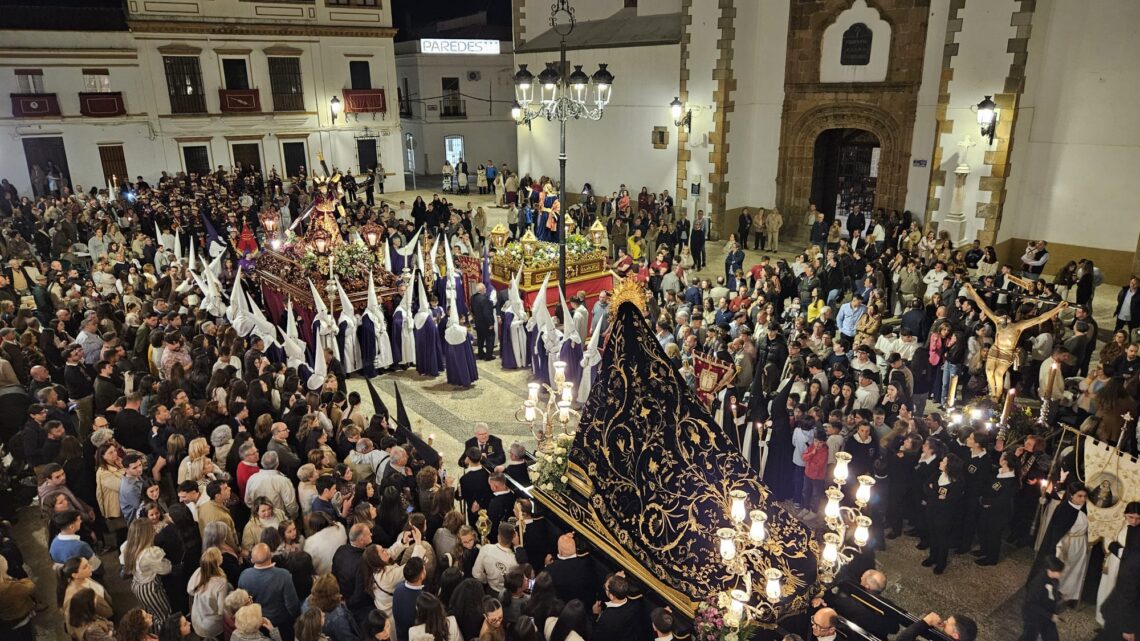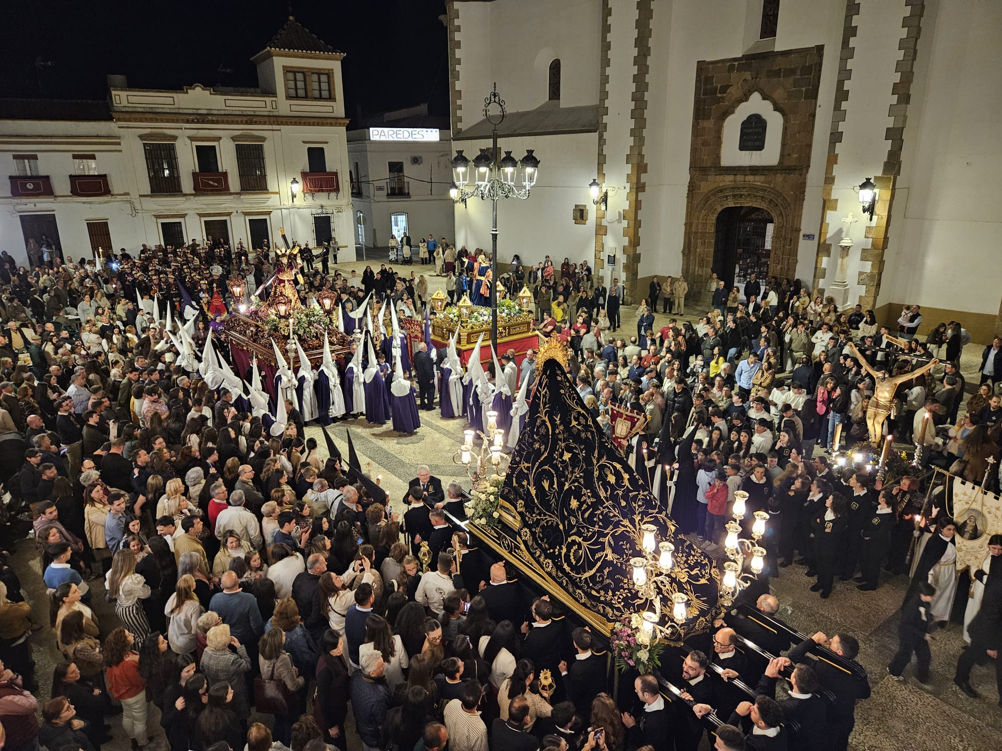 El Evangelista, el Nazareno y la Dolorosa salieron del templo parroquial, mientras que el Cristo de la Caridad vino desde la iglesia de San Juan llevado por sus portadoras, y todos, junto a sus nazarenos, hermanos, las hijas de la Escuela de María, y los pequeños costaleros, se concentraron en la Plaza de España para iniciar el cortejo procesional por las calles de la ciudad.