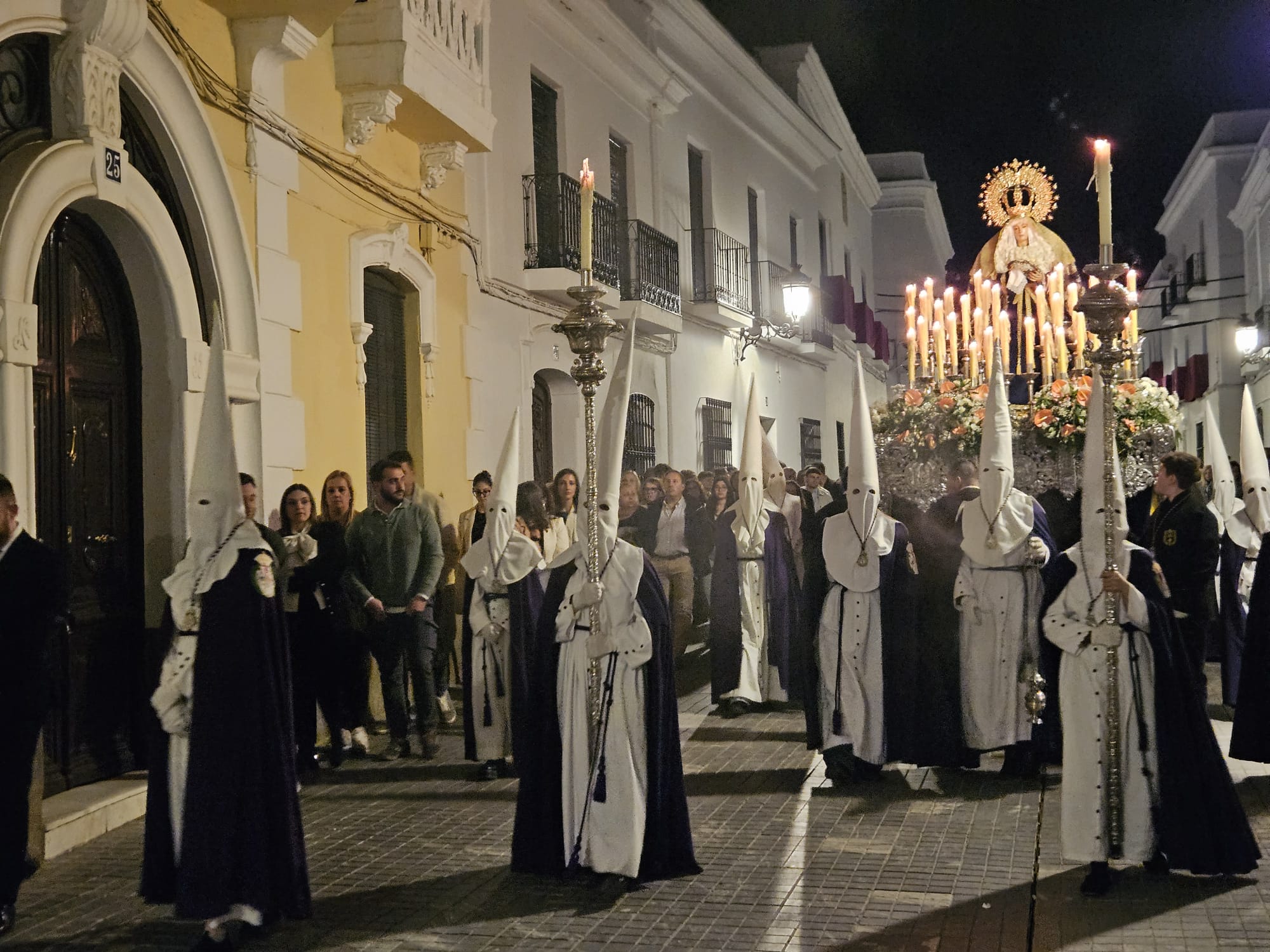 Y otro punto especial del recorrido fue la revirá que el paso de la Soledad realizó entre la calle Espíritu Santo y la calle Tetuán, en la que solo se escucharon las voces de los capataces y el rachear de los costaleros.