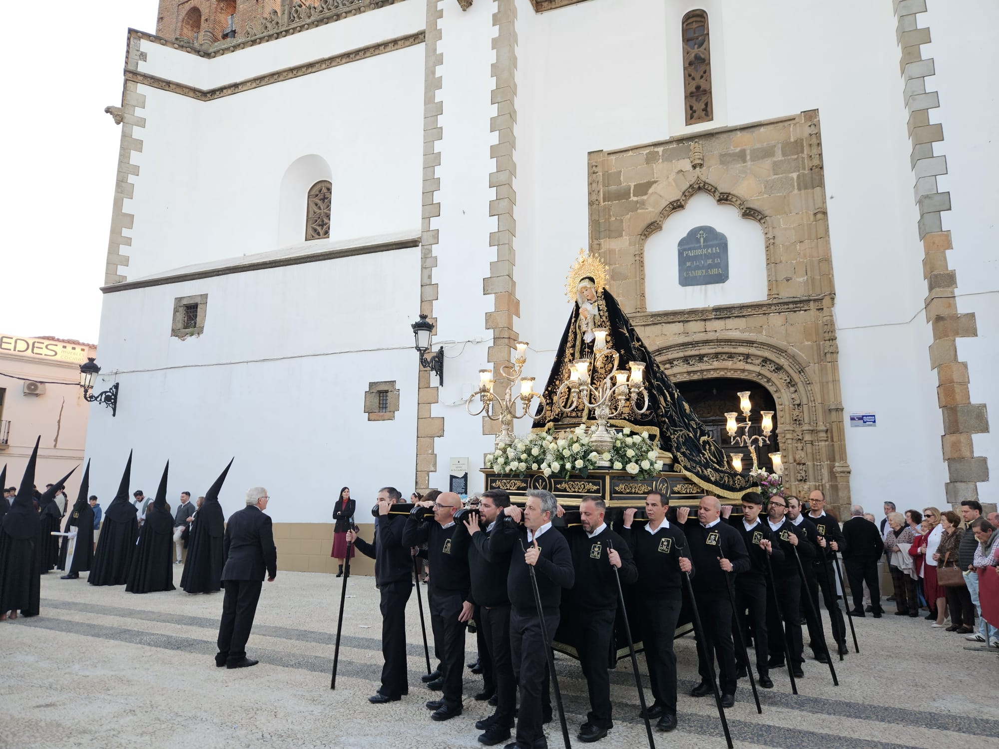 El Viernes Santo en Fuente del Maestre finalizó en la noche de este 3 de abril con la Procesión de María Santísima de la Soledad, que apareció a los brazos de sus costaleros por la estrecha puerta de la iglesia del antiguo Convento Concepcionista.