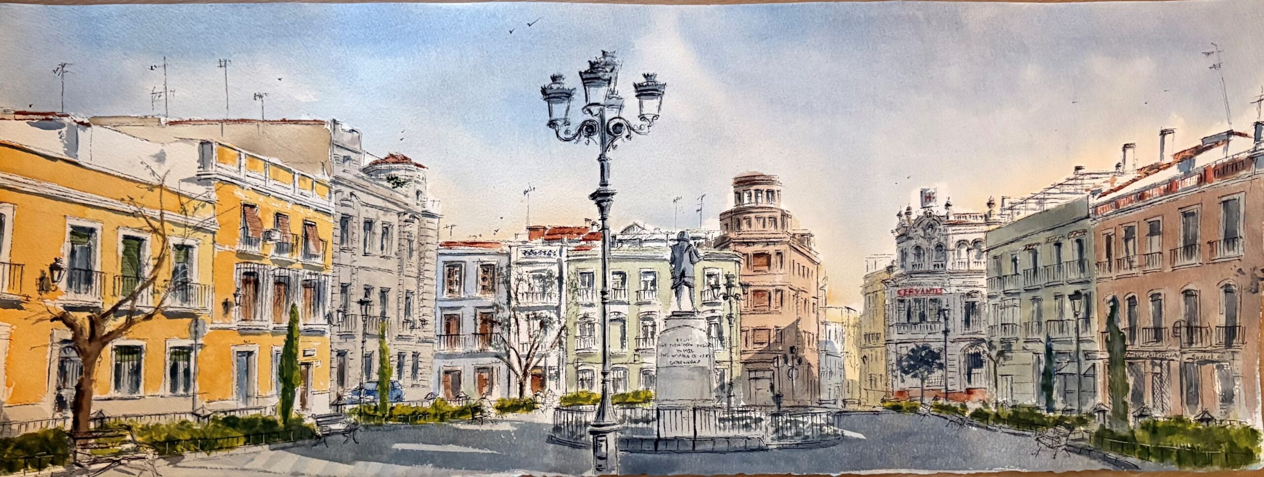 Joaquín Bueno (Badajoz) desarrolla su obra principalmente en acuarela, técnica con la que explora la luz, el movimiento y la identidad de los espacios urbanos. Su trabajo se centra especialmente en los rincones de su ciudad, Badajoz, captando la atmósfera cambiante de sus calles, plazas y edificios históricos. A través de una pincelada suelta y expresiva, busca transmitir no solo la arquitectura, sino también la vida que late en cada escena: la vibración del cielo, la textura de las fachadas y el paso del tiempo sobre los tejados.