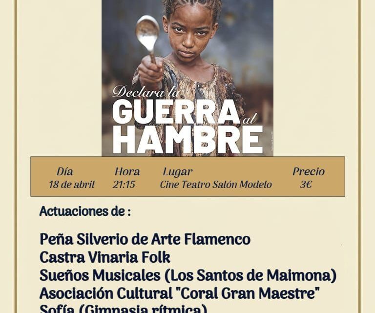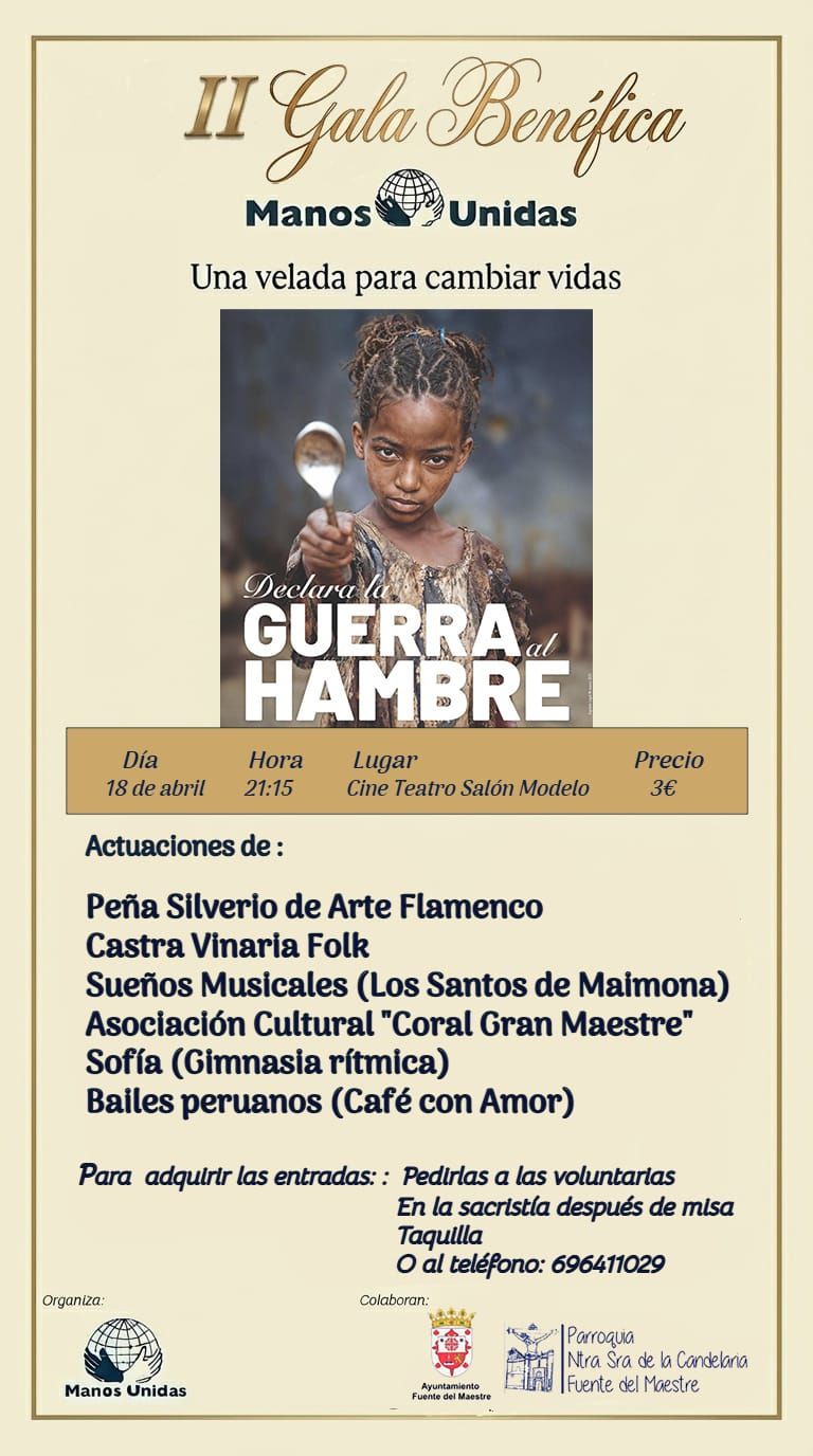 El Grupo de Manos Unidas de Fuente del Maestre ha organizado, para el próximo sábado 18 de Abril, la II Gala Solidaria encuadrada dentro de la campaña de este año, “Declara la Guerra al Hambre”.