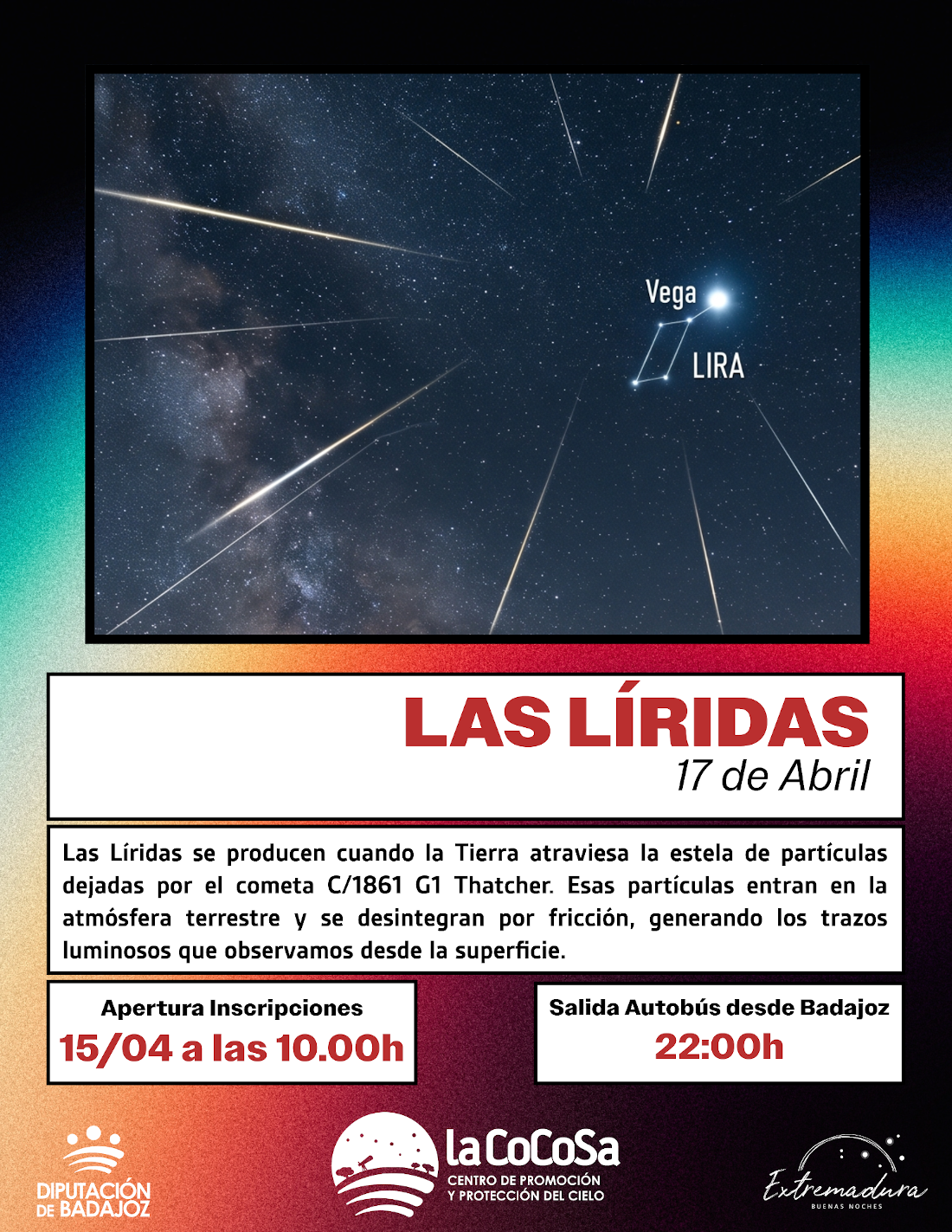 La Diputación de Badajoz, a través del Área de Sostenibilidad Ambiental, Energía y Territorio Verde, celebrará el próximo 17 de abril a las 22.30 horas una nueva observación astronómica en la finca La Cocosa bajo el título ‘Las Líridas’, una cita centrada en la observación de una de las lluvias de estrellas más antiguas de la historia. La actividad forma parte del programa anual 2025–2026 del Centro de Promoción y Protección del Cielo (CPPC) y contará con servicio de autobús gratuito desde Badajoz, con salida prevista a las 22.00 horas.