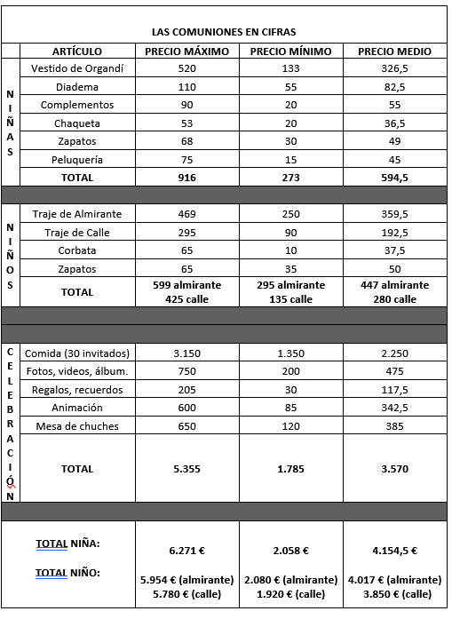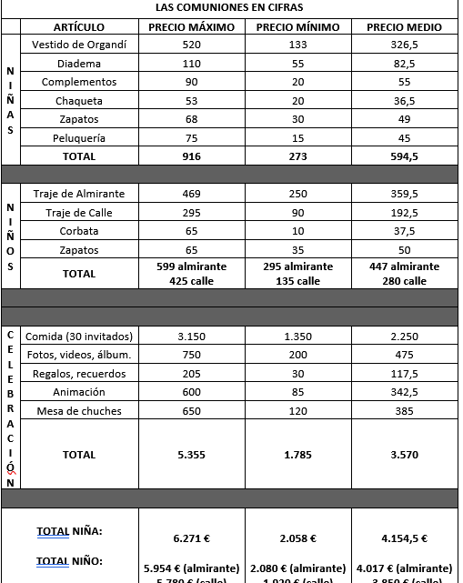 UCE ha explicado que si retrocedemos muchos años en el tiempo, nos encontramos con que la comunión era una fiesta muy austera, en la que simplemente se hacía una merienda o un pequeño banquete en casa con los amigos y familiares más cercanos. En la actualidad, las cosas son muy distintas. El gasto medio de la celebración de la primera comunión, con 30 invitados, para las familias extremeñas asciende a una media de superior a 4.100 euros, prácticamente un 25% más que el año pasado.